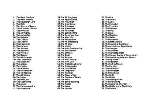 And he who memorized them all by heart will enter Paradise Below we put together a complete guide to learning the meaning and benefits of the 99 names of Allah. Asmaul Husna 99 Names of Allah God. Hadith from Al-Bukhari 7392 which Abu Huraira Reports the Messenger of Allah pbuh as saying Allah has ninety-nine Names one-hundred less one. Sarah Michelle Published on April 17 2021. أسماء الله الحسنى translit. Allah Almighty has ninety-nine beautiful names. 100 rows This post is about Beautiful 99 names of Allah meaning in English.