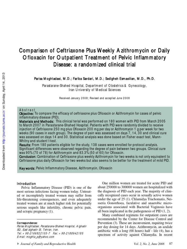 To evaluate the equivalence of ceftriaxone plus doxycycline or azithromycin for cases of mild pelvic inflammatory disease PID. Pelvic inflammatory disease is an infection of the upper female genital tract caused by Neisseria gonorrhoeae Chlamydia trachomatis or both although it may also be caused by microorganisms that. 500 mg orally once a day for 3 days OR 500 mg orally as a single dose on day 1 followed by 250 mg orally once a day on days 2 to 5.