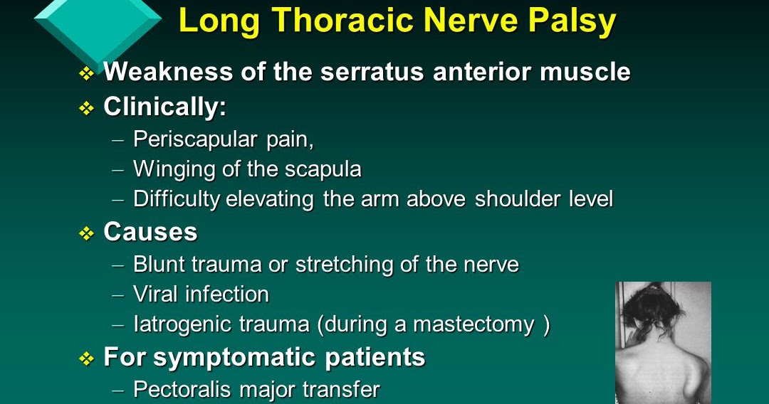 Treatment of LTN Palsy. Transfer of Pectoralis Major Tendon A 37-mm spade-tip drill Arthrex is used to form. The lateral aspect of the scapula just above the tip is then prepared by use of a high-speed acorn-tip burr and rongeur before transfer of the pectoralis major muscle with its bony attachment Fig 5. Long thoracic nerve dysfunction may result from trauma or may occur without injury. Surgical decompression and neurolysis appears to be an effective and rational treatment modality in specific instances where supraclavicular injury to the long thoracic nerve is identified. Physiotherapy is the mainstay of treatment. It usually can be found adjacent to the lateral thoracic arterys origin and runs along the serratus anterior.