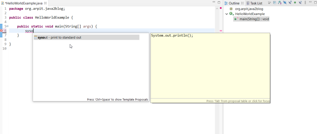 Shortcut to add a main method and systemoutprintln in eclipse. Systemoutprintln sysout and Ctrl Space When working with console applications youll need to use Systemoutprintln for printing messages. Tested with IntelliJ IDEA 201933 Community Edition on Windows machine.