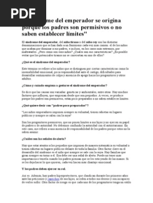 Sindrome del niño emperador pdf. Porque los padres son permisivos o no saben establecer lmites El sndrome del emperador del nio tirano o del nio rey son las distintas denominaciones que se han dado a un fenmeno cada vez ms comn. Aunque cada niño es un mundo existen unas pautas de comportamiento que comparten aquellos que sufren el síndrome del emperador. También conocido como síndrome del niño tirano o del niño rey el síndrome del emperador es un trastorno de conducta que se caracteriza por el sentimiento de autoridad que tiene la persona afectada.